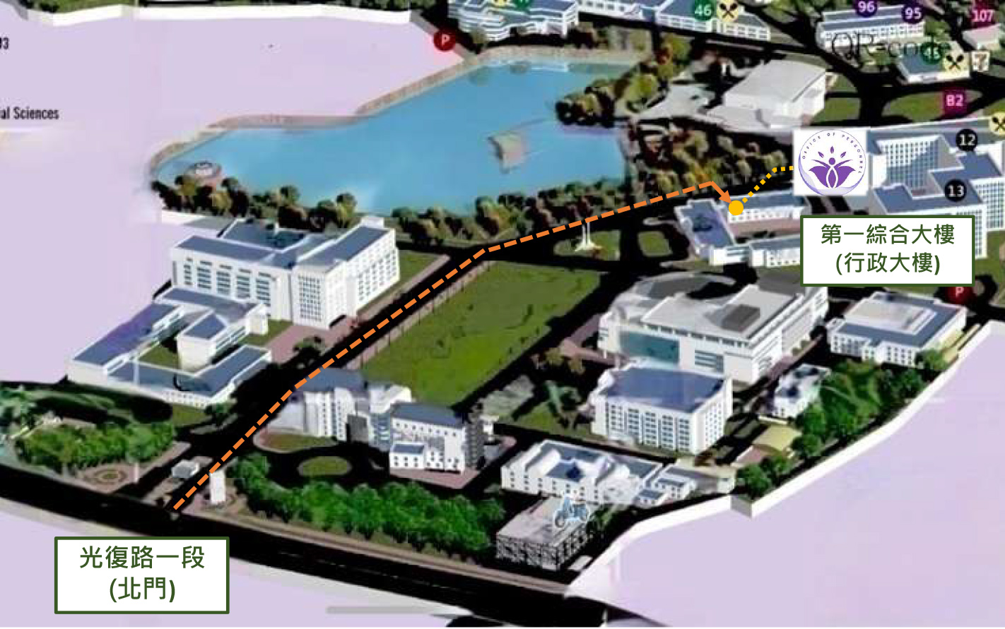 直行經過三角鐘後,即為第一綜合大樓(行政大樓),人事室位於行政大樓一樓。